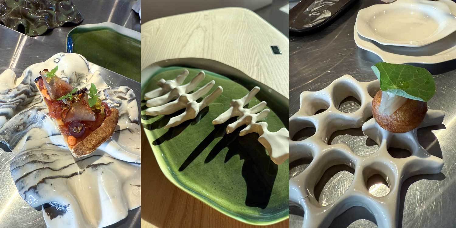 Dish. Plating issue. Conversation. Brief. Experimentation with clay, glazes, forms, and techniques. First samples. De-brief. Kitchen testing. Redesign if needed. Then, finally, the first real product batches emerge from the kilns.