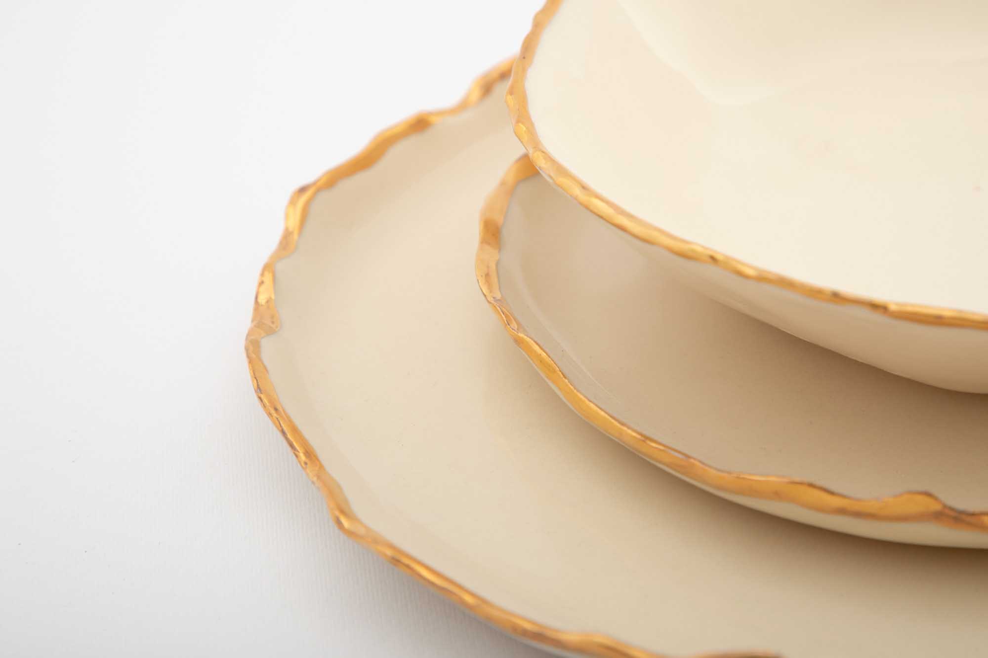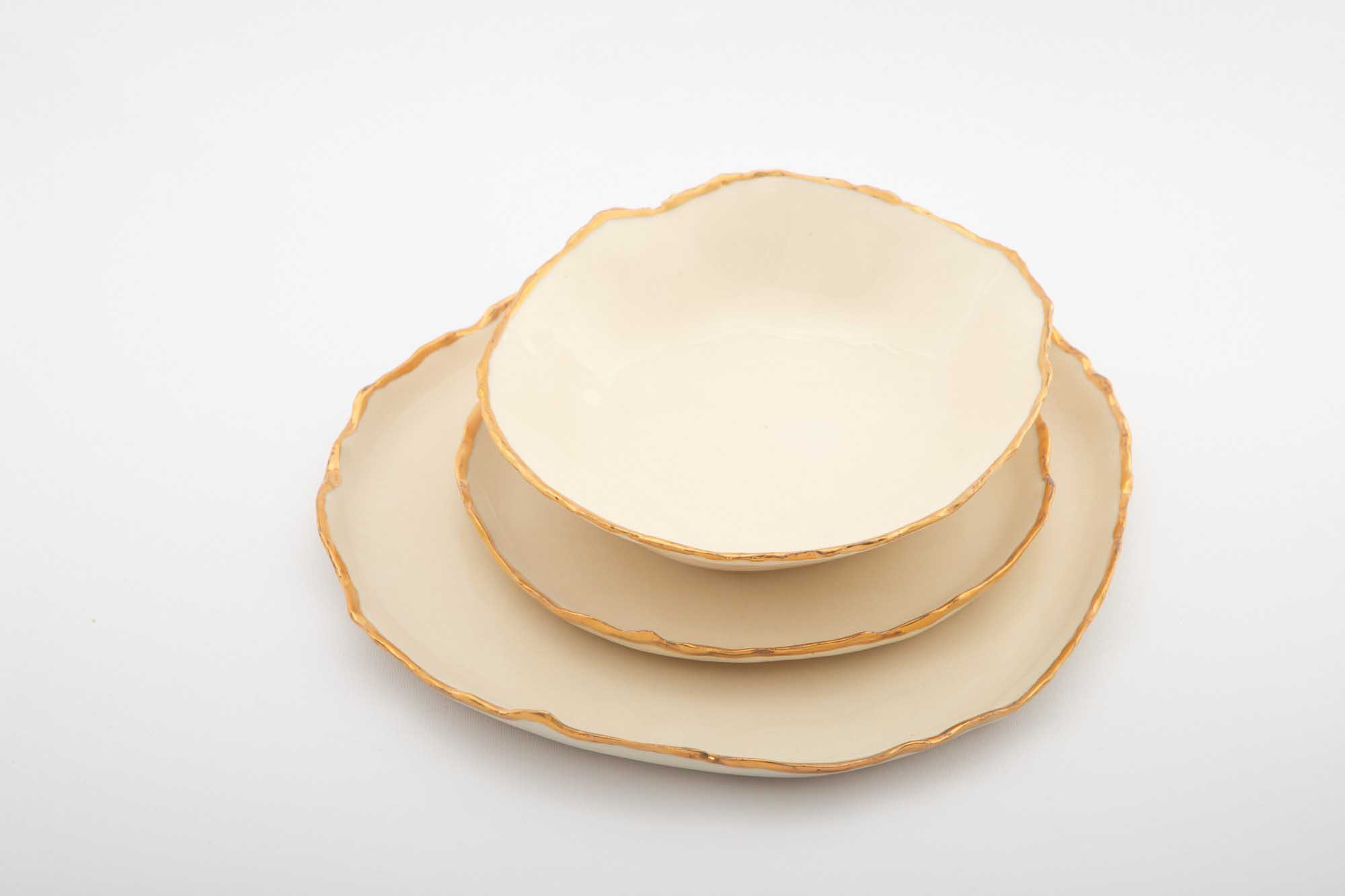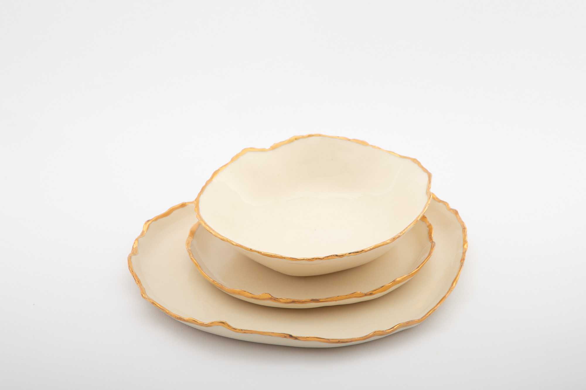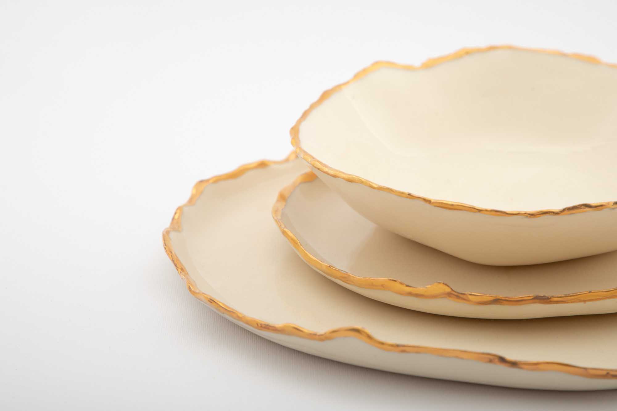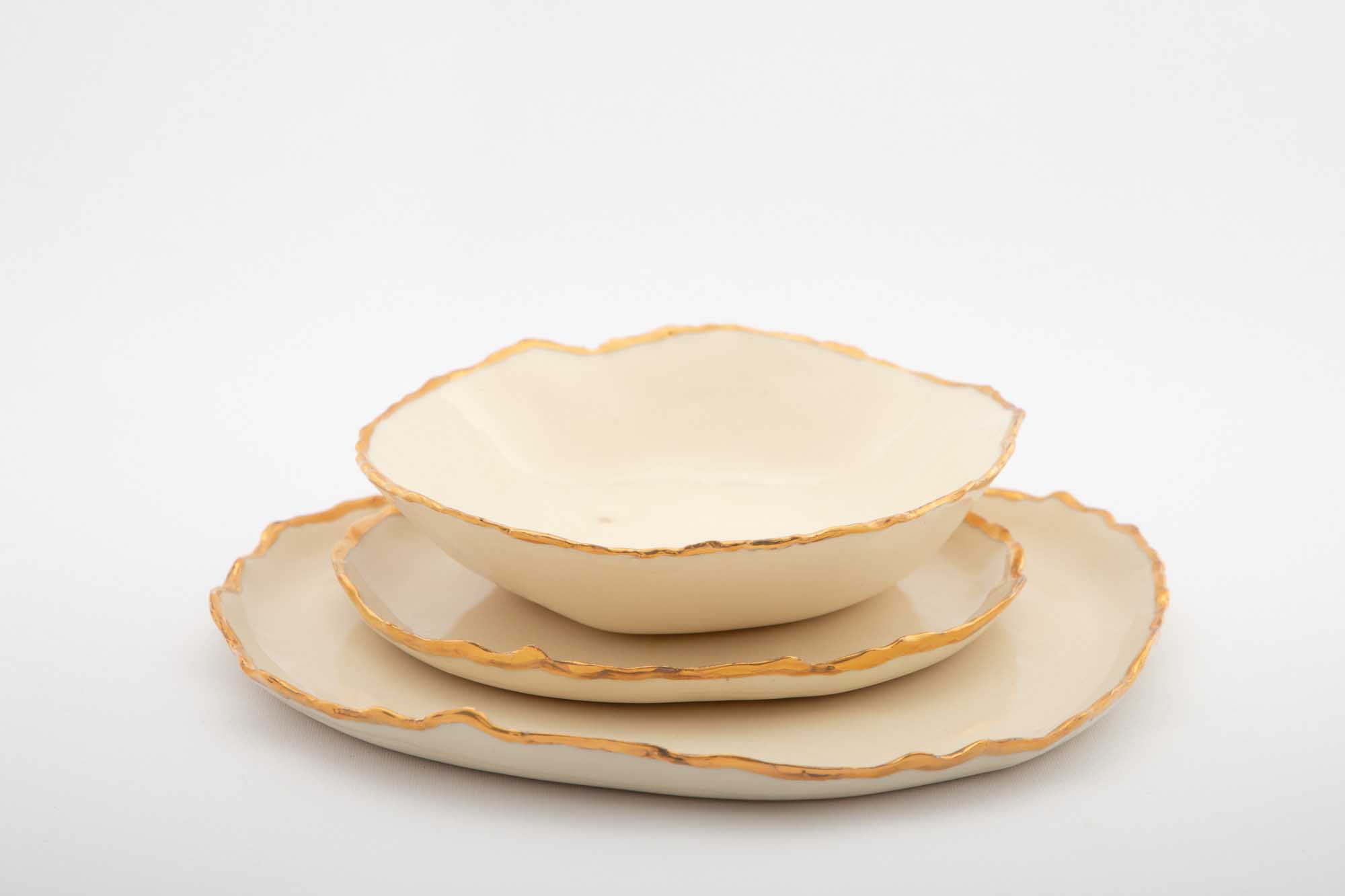 Each piece is outlined with a shimmering, hand-painted golden rim, highlighting the natural, irregular edges that make the collection so distinctive. Individually shaped and glazed by hand, no two are exactly alike — every set carries its own artistic character.