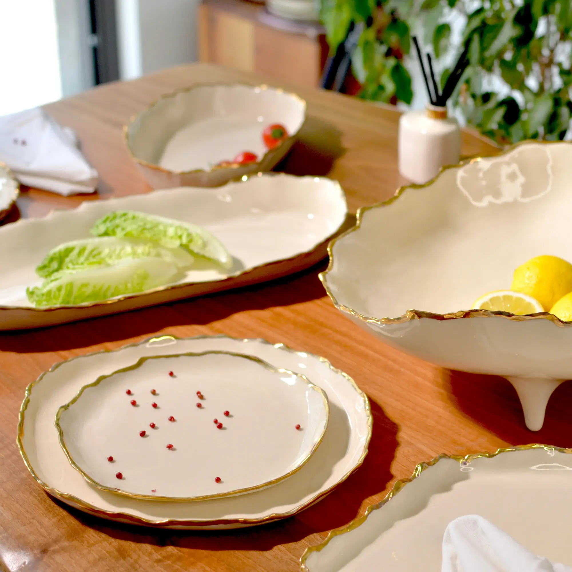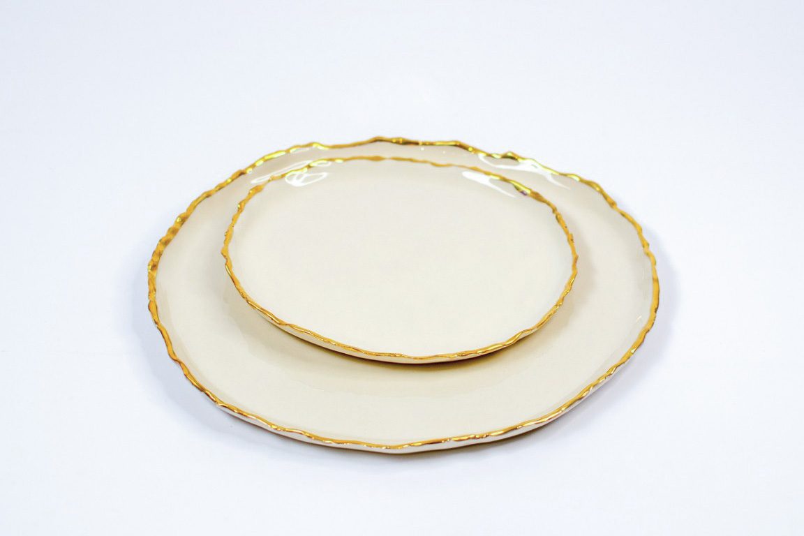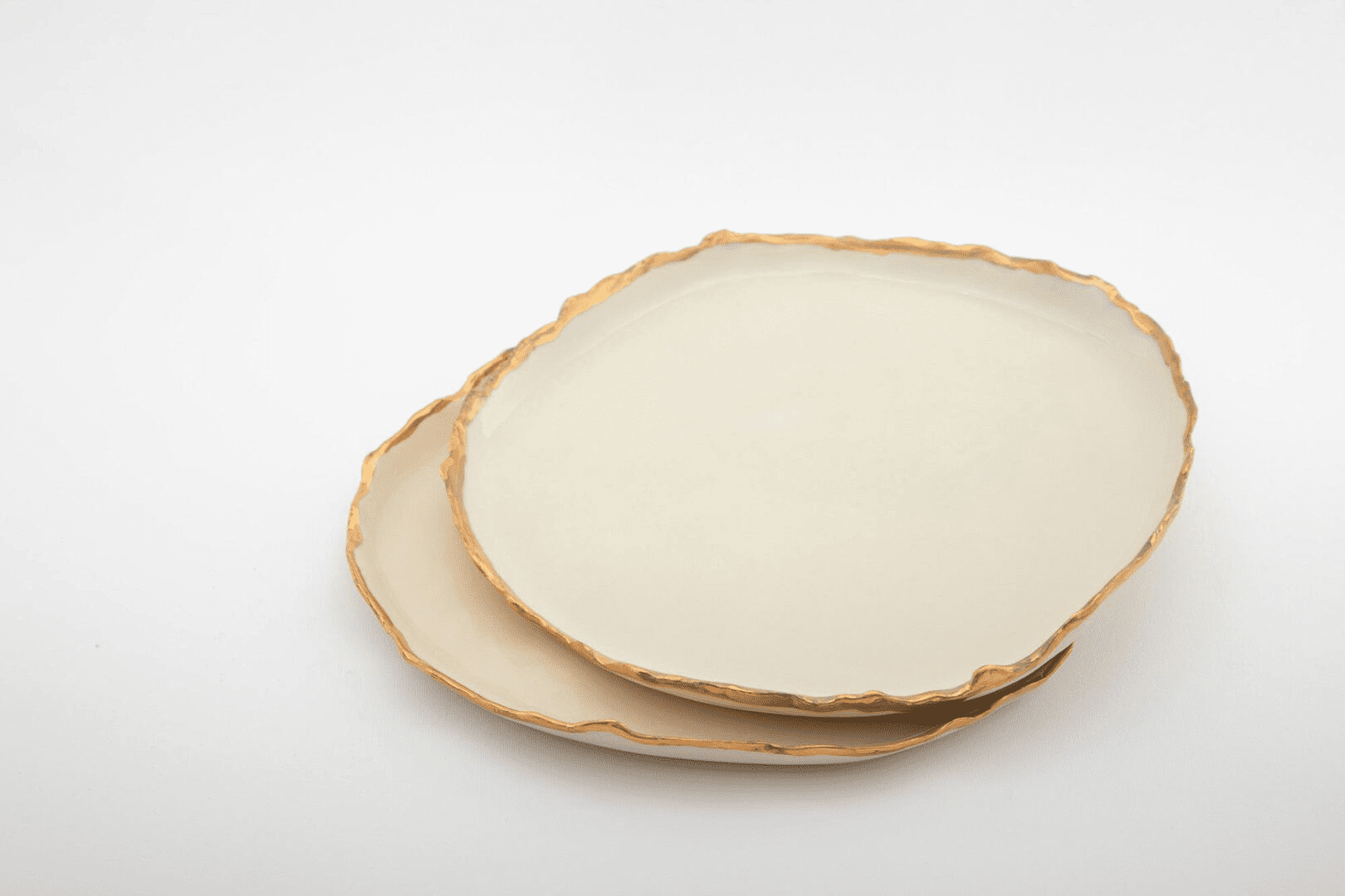A pair of handmade porcelain dinner plates, each outlined with a shimmering hand-painted golden edge. The softly irregular rims celebrate the beauty of imperfection, giving every piece a distinct sculptural presence on the table.