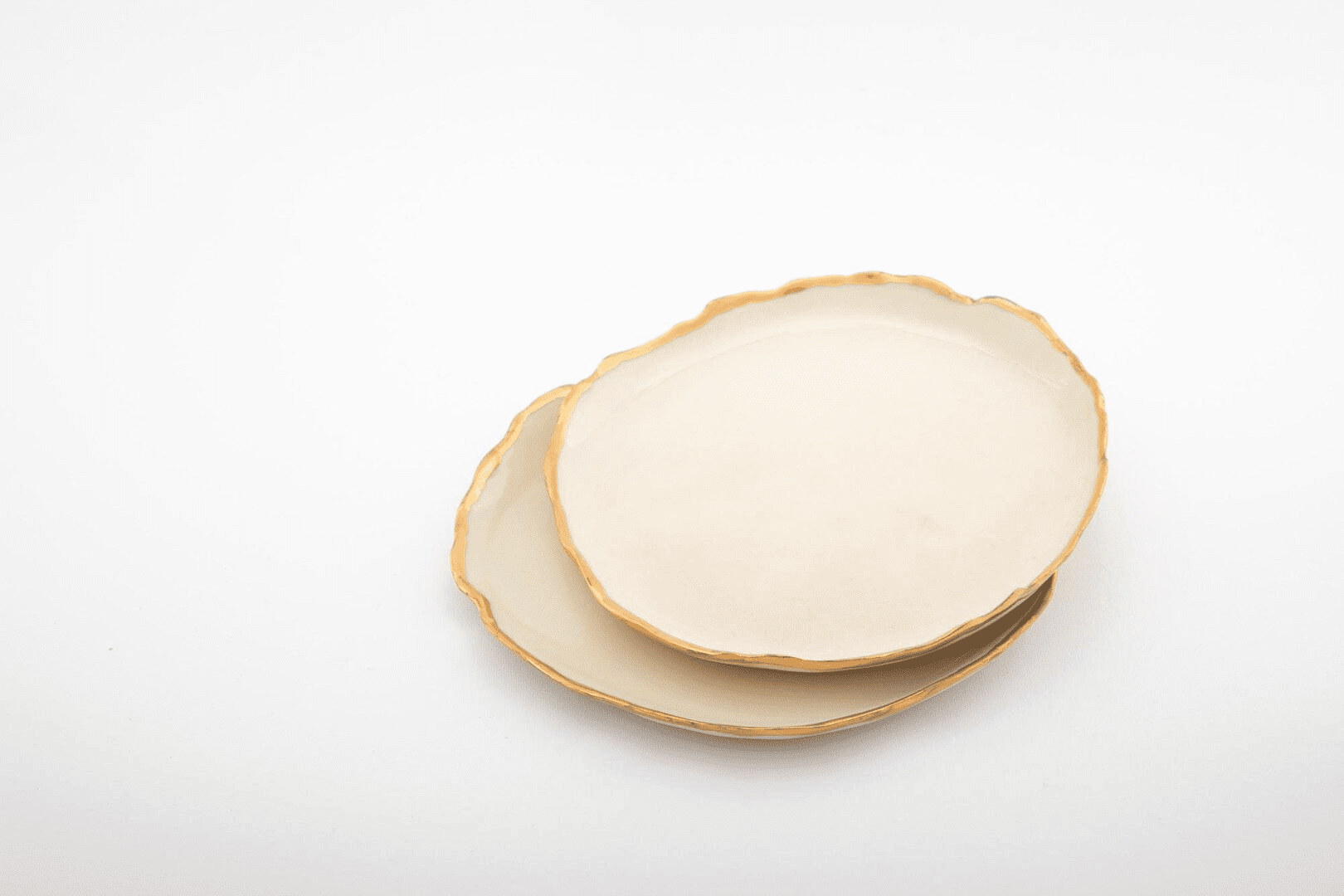 A pair of handmade porcelain side plates, each framed by a hand-painted golden rim with softly irregular edges. Perfect for bread, starters, or desserts, these plates bring sculptural elegance to both everyday meals and festive gatherings.