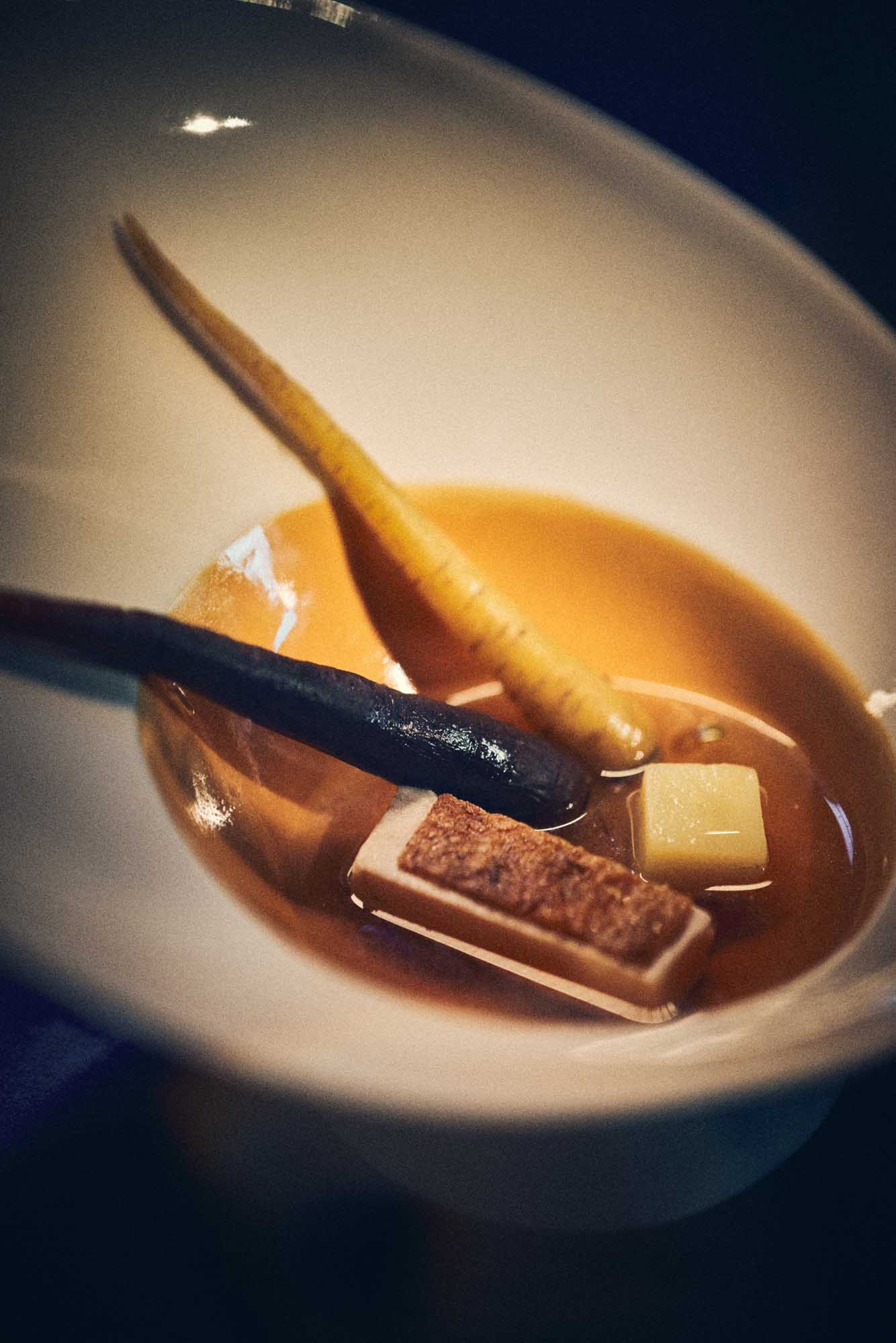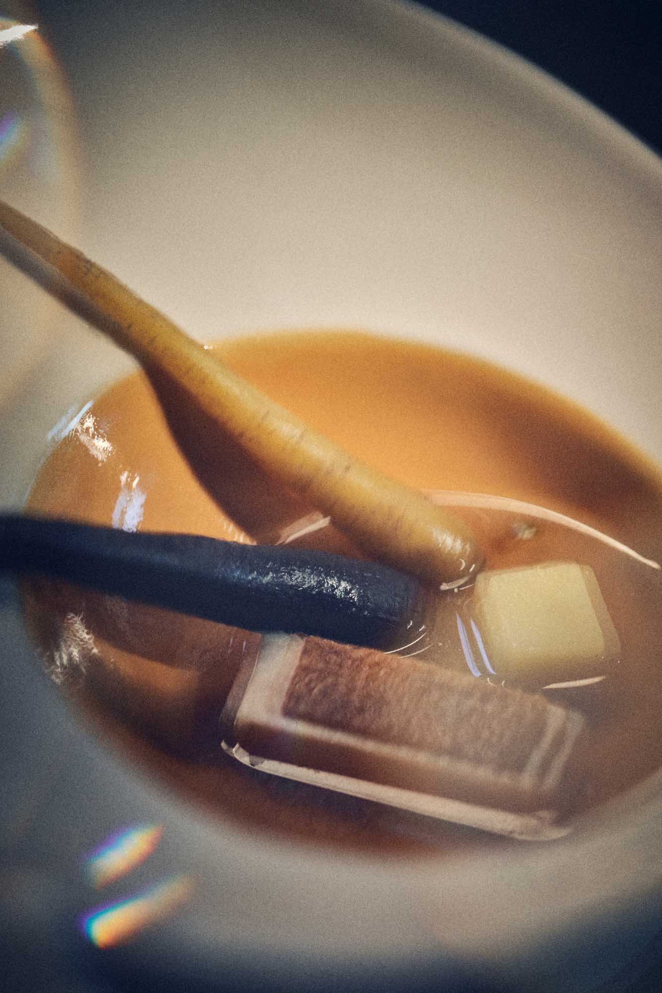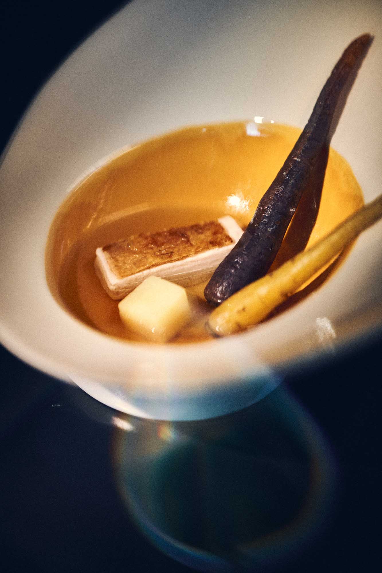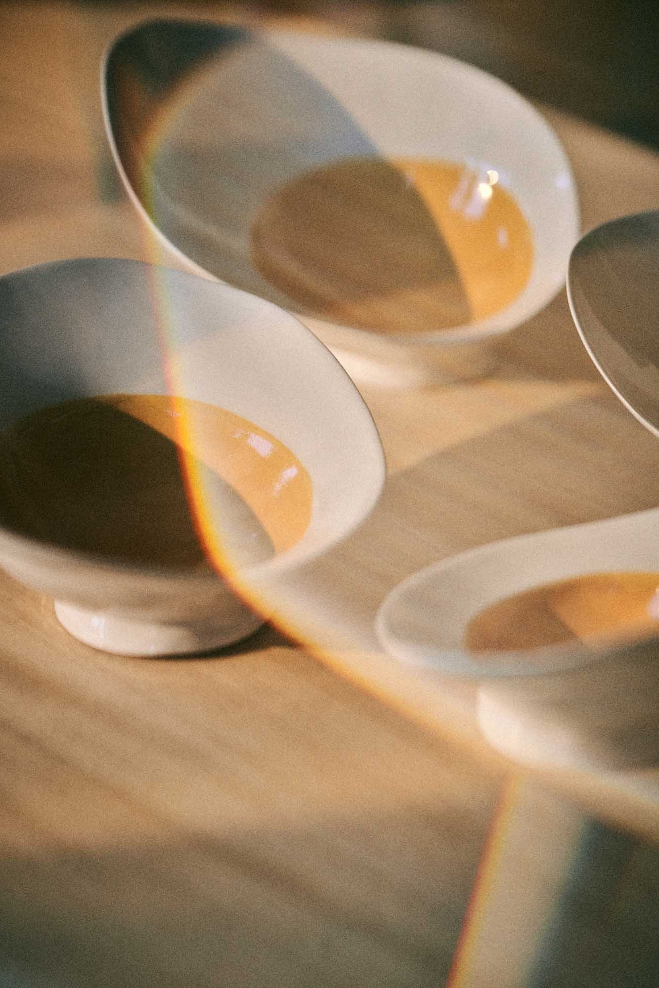 Its glazed interior holds and reflects liquid like a contained world – broths, yolks, and subtle colors unfolding in depth. The curved form allows the dish to gather naturally, guiding every movement of the spoon. The exterior remains transparently glazed with, preserving the beautiful warm white color of our porcelain. Each plate is unique.