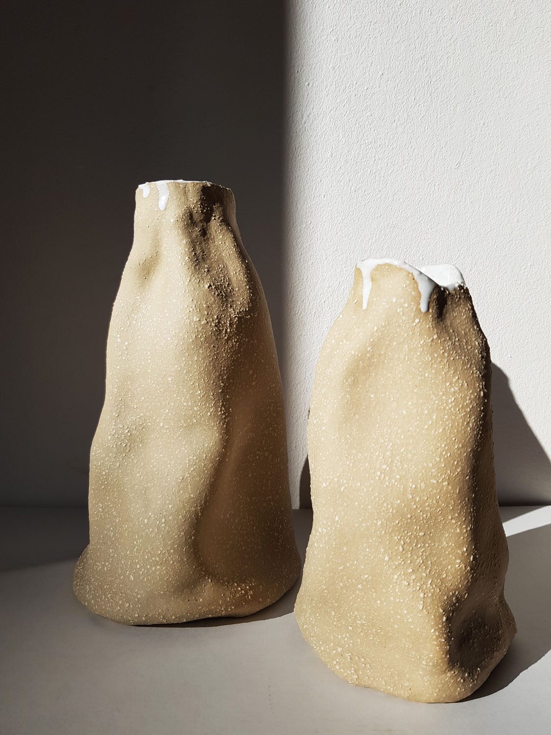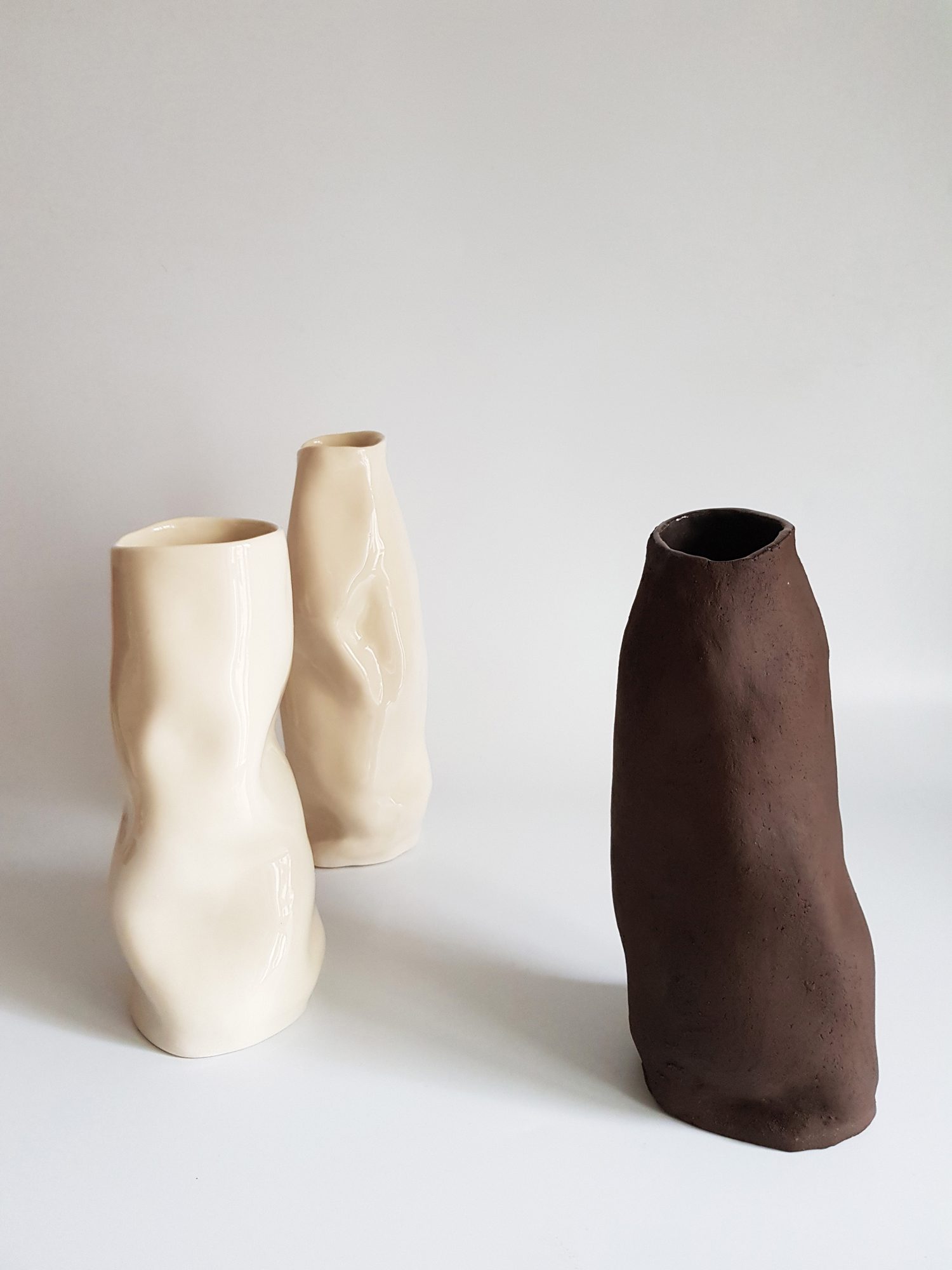 Each piece is built around the tension between materials: smooth, glossy white porcelain meets unglazed, textured clays—some coarse and grogged, others soft and earthy. We highlight the natural textures of chamotte-rich clay by carving or shaping in ways that reveal its grain. The result is a tactile dialogue between surfaces—refined and raw, luminous and matte.