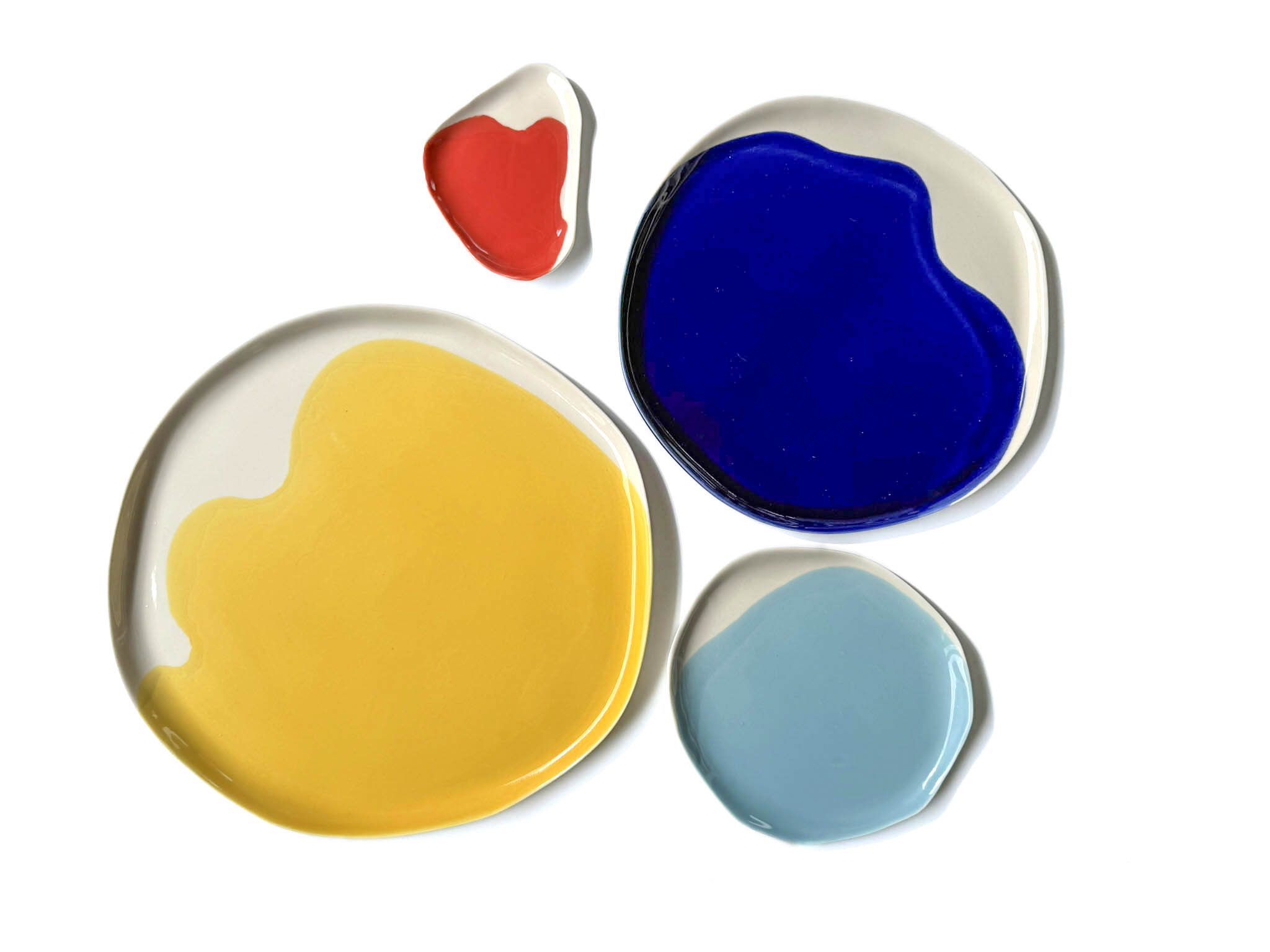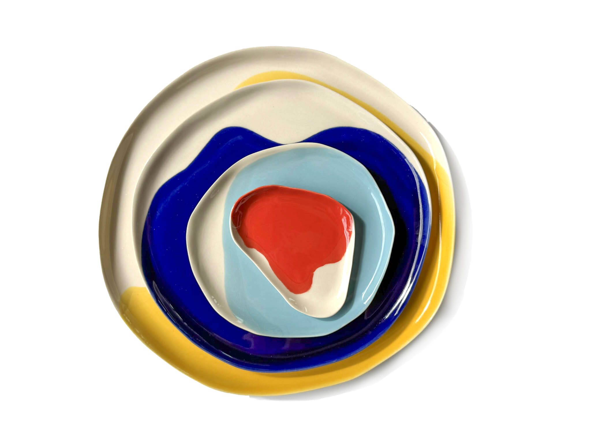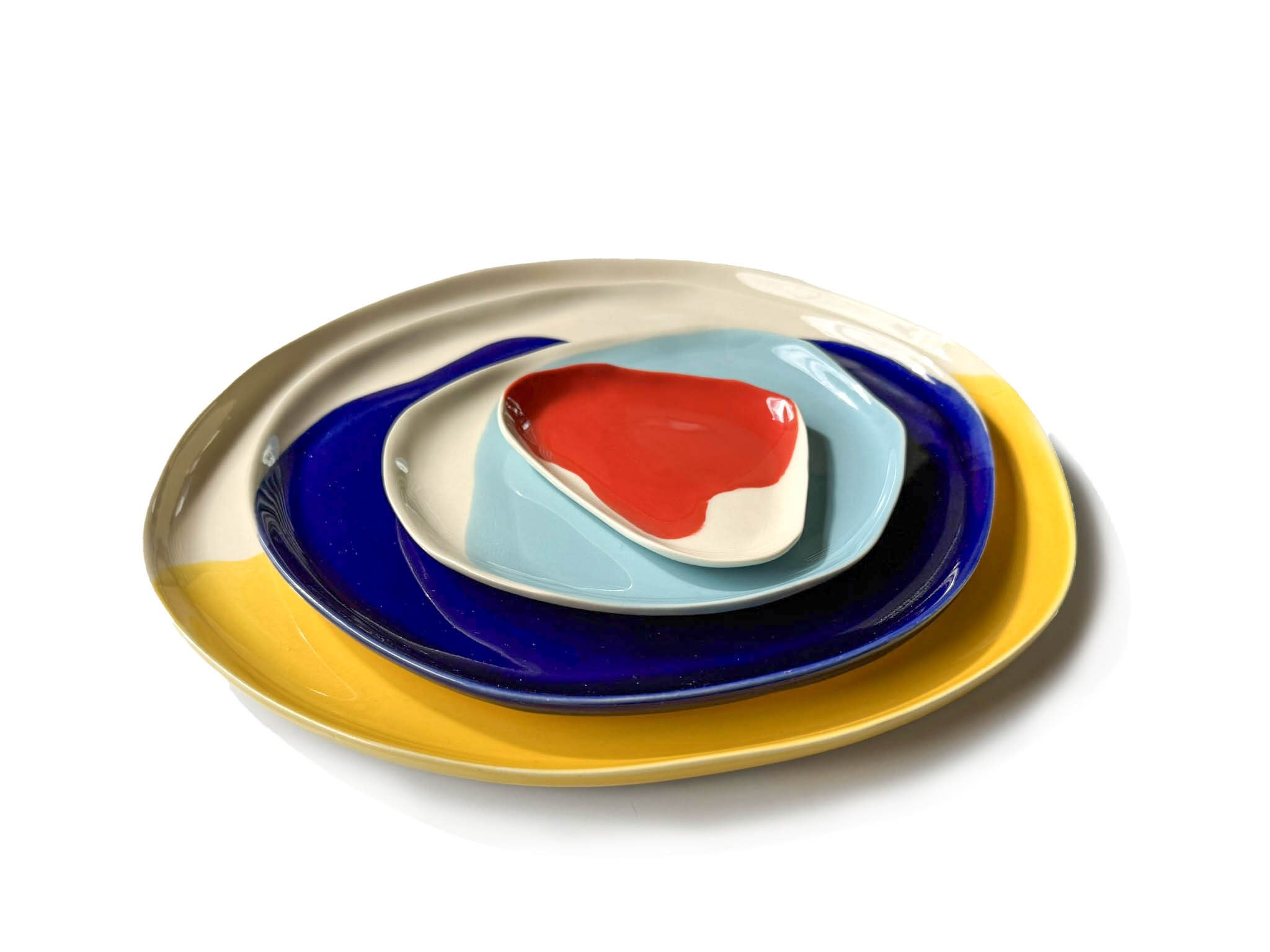 Featuring royal blue, red scarlet, cadmium yellow, and sky blue, each plate is uniquely hand-glazed and organically shaped.