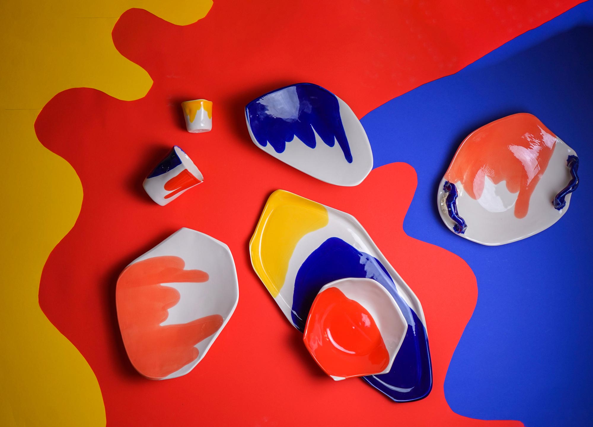 Its sculptural form combines royal blue and cadmium yellow in bold, flowing shapes over natural porcelain — a statement piece that turns every table into a canvas.