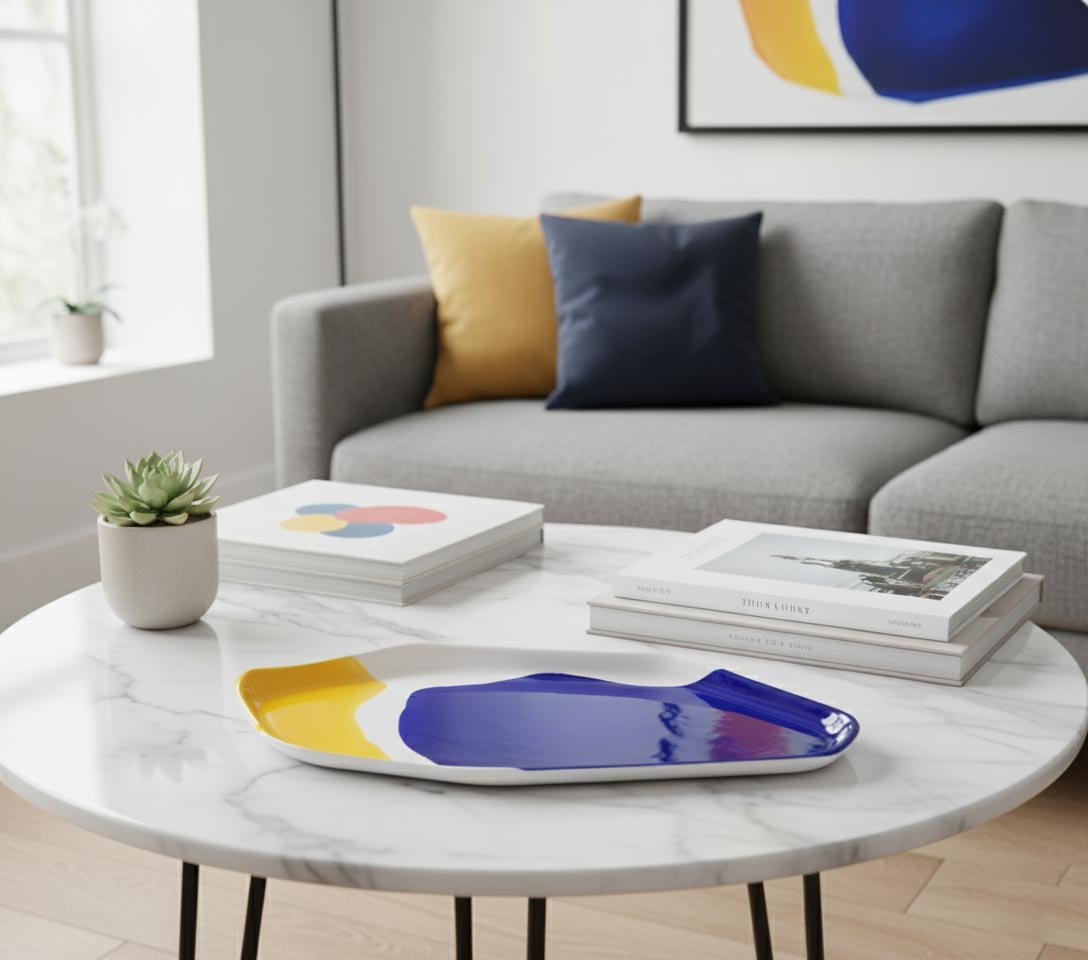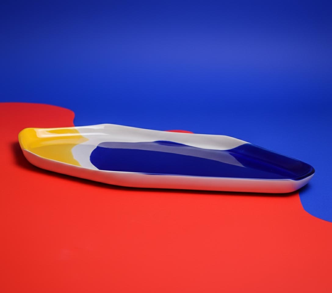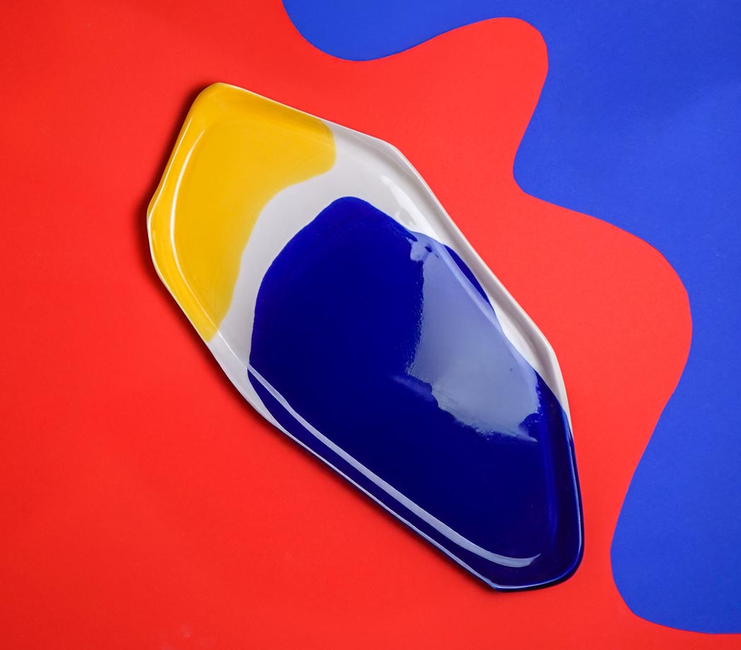 A handmade porcelain serving tray inspired by Bauhaus design and color harmony.