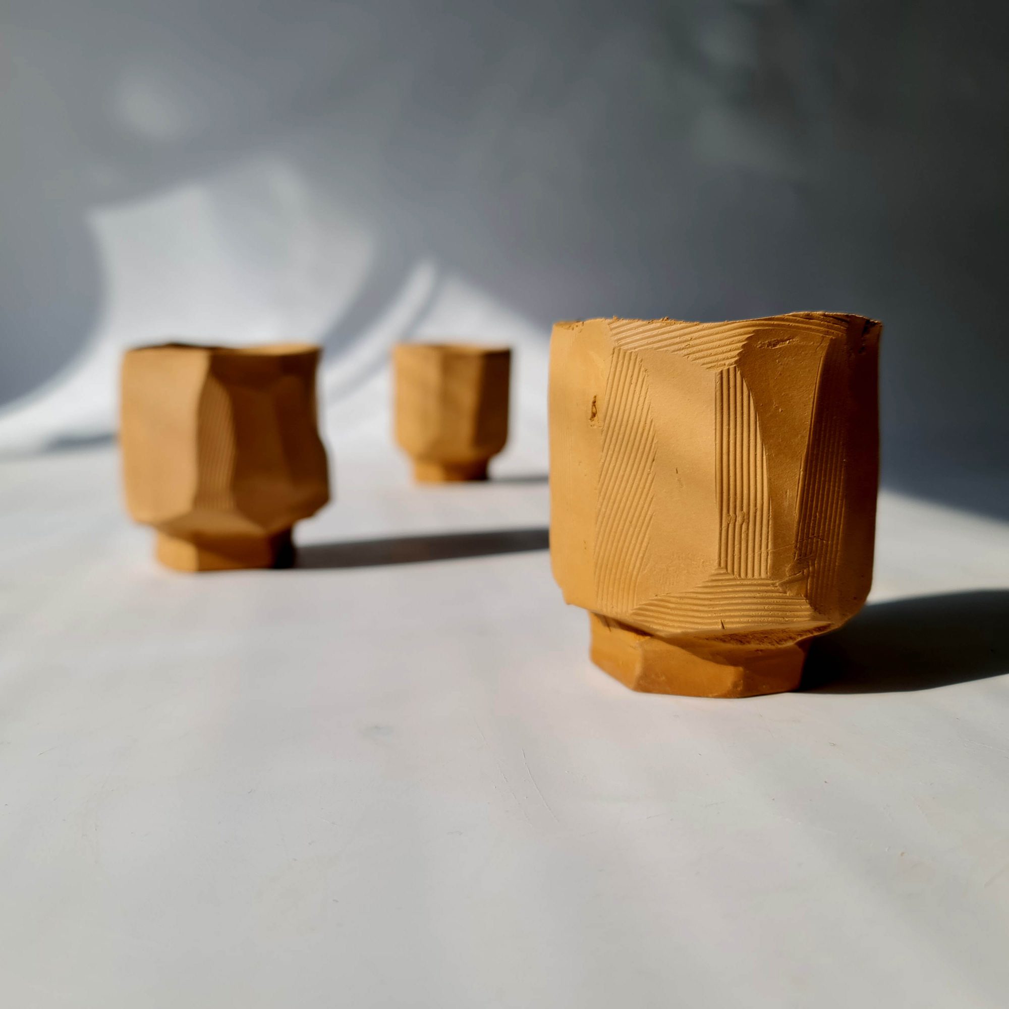 Create three small candle cups from warm red clay, decorate them with coloured engobes, and we will finish them as scented candles for you.