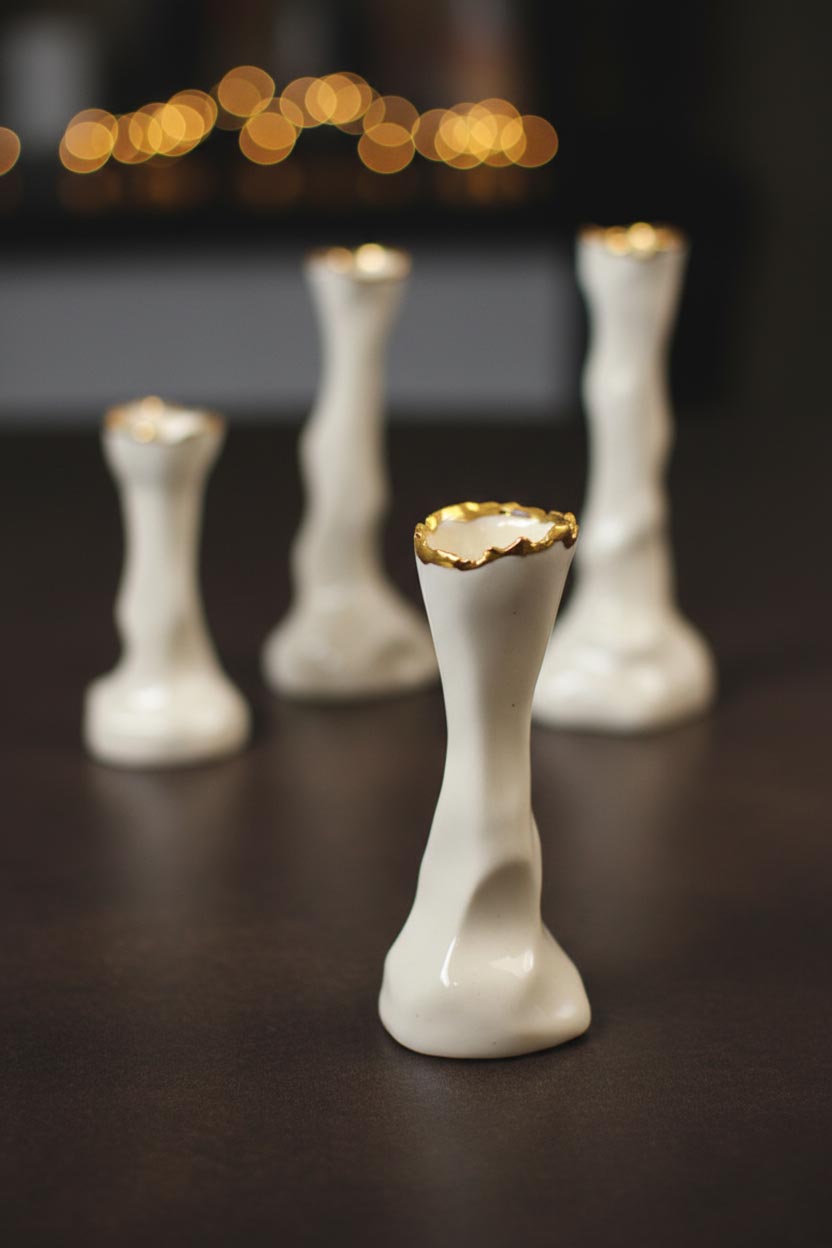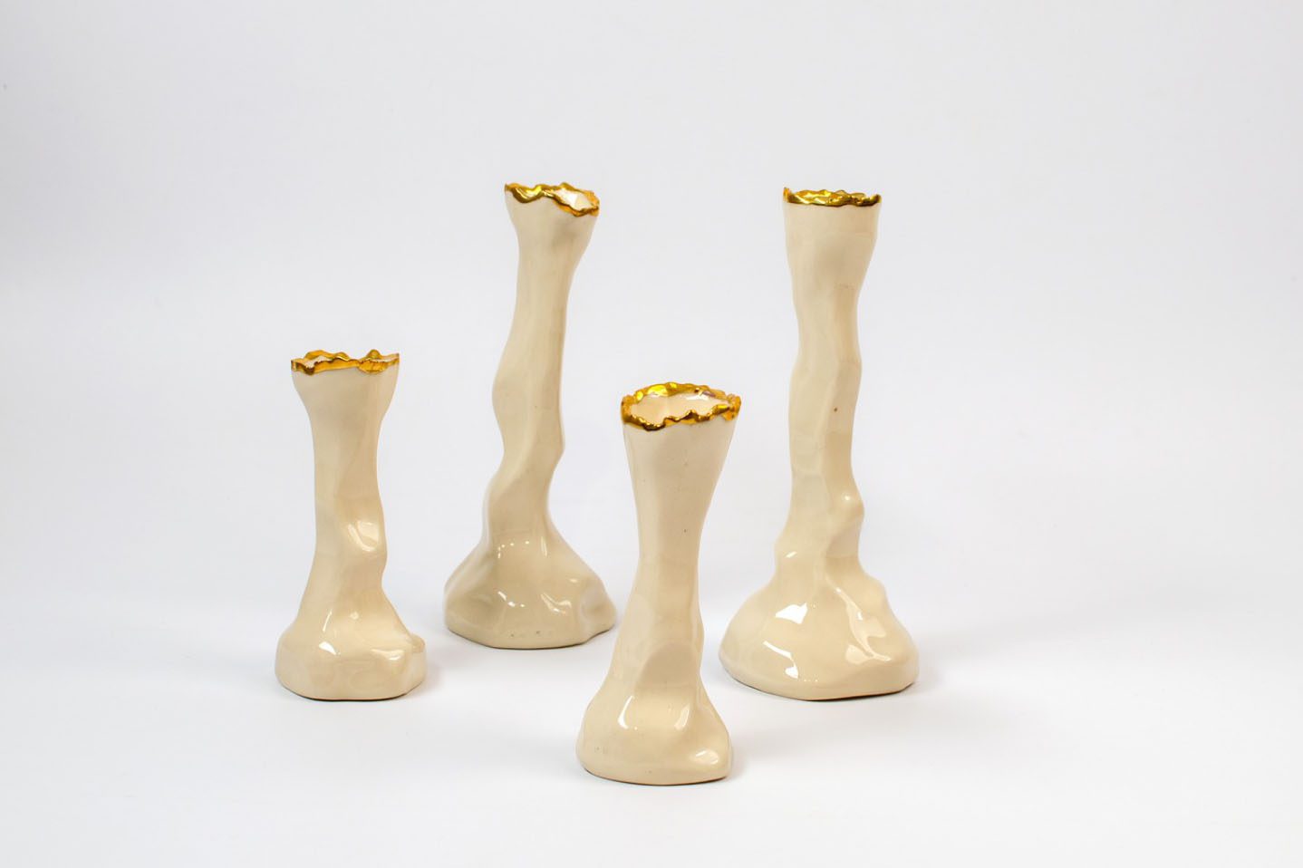 A handmade porcelain candleholder that captures the fluid elegance of organic form. Each piece rises from a soft, sculptural base into a slender, uneven silhouette, crowned by a delicately hand-painted golden rim. When lit, the candlelight reflects off the gold, casting a warm and poetic glow.